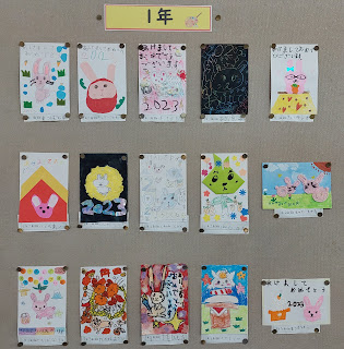 全ての学年に、冬休みの宿題として出されていた年賀状。毎年職員室前に張り出されて(誰の作かわからないように)、年賀状コンクールが行われます。初参加の1年生。毛糸を使ったりと工夫も見られます。2年生。時間をかけて一所懸命かいたことがうかがえます(o^―^o)3年生。富士山ウサギ、しめ縄ウサギ、アーニャうさぎなど、個性的な作品がいっぱいです(^▽^)4年生。寅から兎へのバトンパスやちぎり絵など、アングルもとても素敵です。5年生。人気のキャラクターと兎をうまく合わせたりみごとな切り絵の作品など、力作が並びます。6年生。「こんな年賀状、もらったら嬉しいだろうな♪」という力作がそろいます。投票の紙を持って真剣に年賀状を見る子どもたち。各学年から「金賞」「銀賞」「銅賞」が選ばれます。金賞をとるのはどの年賀状かな?結果が楽しみです。